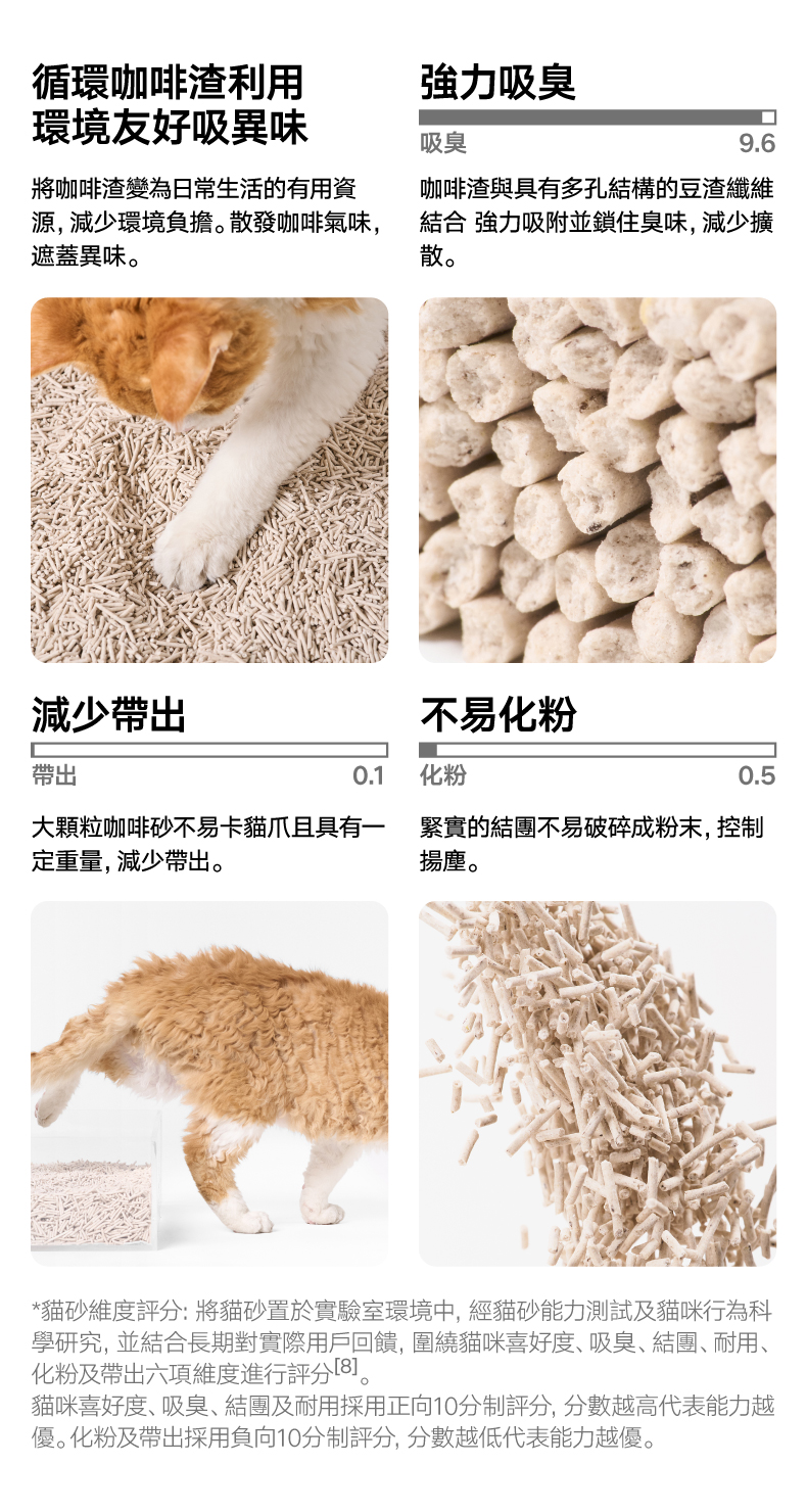咖啡砂主要原料:植物基混合物 (豆渣纖維、木薯玉米小麥澱粉、咖啡渣等),碳酸鈣、二氧化矽等混合物,瓜爾膠等